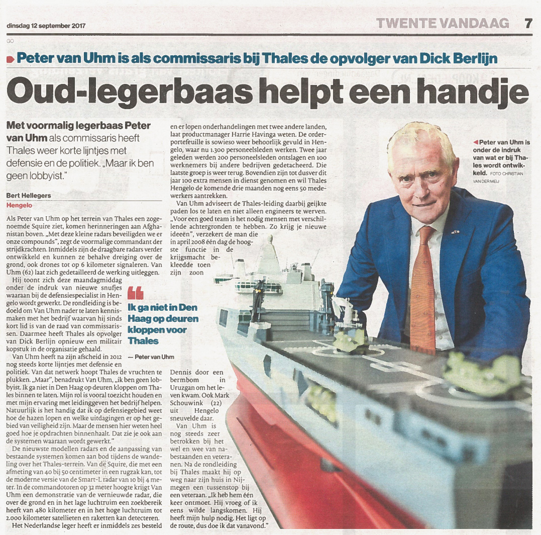 Thales in het nieuws -In de regionale krant Tubantia is op dinsdag 12 september een interview gepubliceerd met onze commissaris Peter van Uhm. De aanleiding van het interview was een introductieprogramma dat maandag 11 september in Hengelo plaatsvond. De dag was onderdeel van een introductietour, de vestigingen in Huizen en Eindhoven komen natuurlijk ook aan bod.